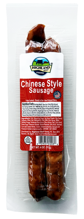 Traditional style Chinese sausage with an authentic taste. Ready to eat or try it warmed. A tasty addition to your favorite dishes to boost flavor. No refrigeration needed.
